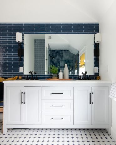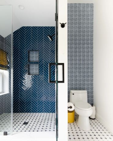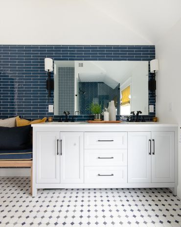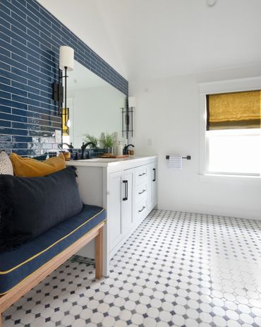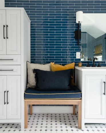 We were brought in midway with this project, a primary suite addition including a bedroom, bathroom, and walk-in closet. In the bathroom, the client had already chosen cabinetry, fixtures, and hardware but needed help choosing tile, a window treatment, and something to fill a large gap left between the vanity and linen cabinet. We suggested a bench to fill the gap, both as an opportunity to add some softness to the room and as a convenient spot to sit when needed. For the tile we chose three different patterns - classic grey and white marble for the floor with a quatrefoil pattern, a navy and white tile with a lot of movement for the tall wall in the toilet nook, and glossy blue rectangular tile used in a subway pattern behind the vanity and lay in a herringbone pattern inside the shower enclosure. We had a cushion for the bench upholstered in navy blue with gold welting and echoed this color combination with a gold linen roman shade edged in navy circle trim.